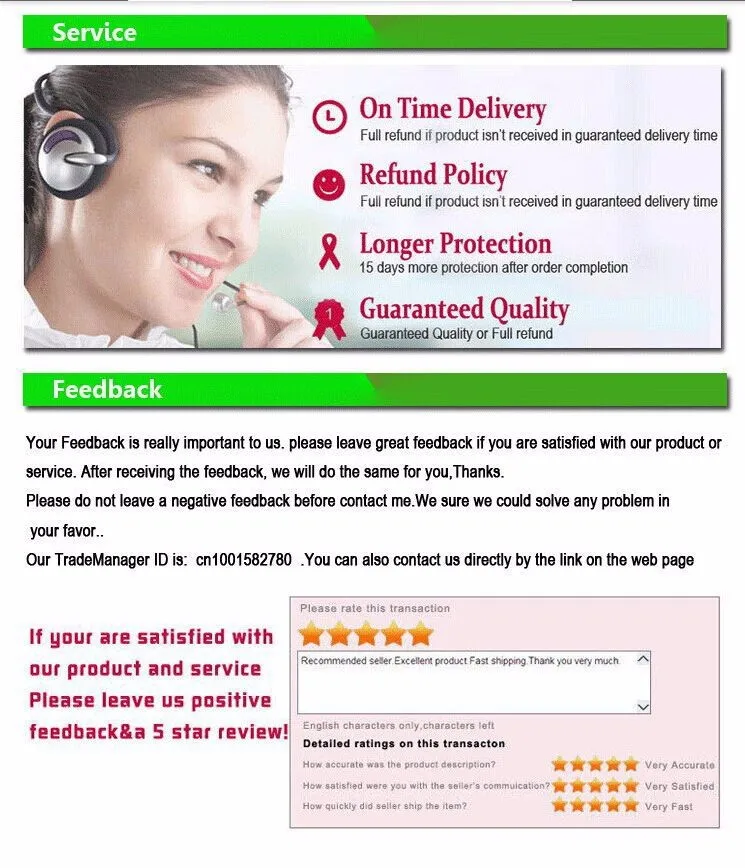 If you like our product ,please give us 5 star postive feedback.Any problem,please contact us before leaving negative feedback and opening the dispute,we would like to work together with you as soon as possible to resolve any dispute.
