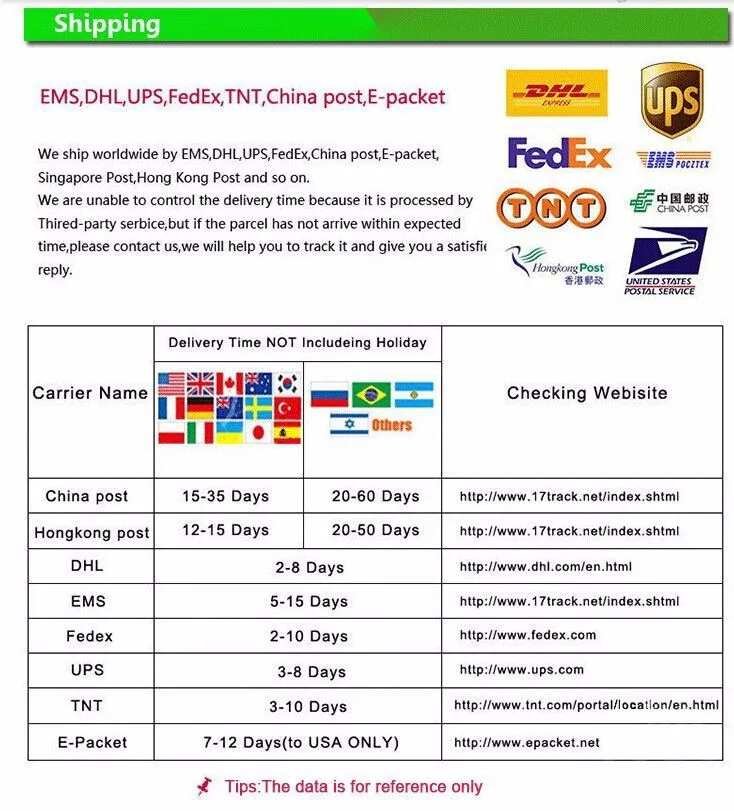 2:We will ship iterm via China post,E-packets,and etc.If you have any special requirement from you,pls let us know in advance and we will adjust related shippment charge.
